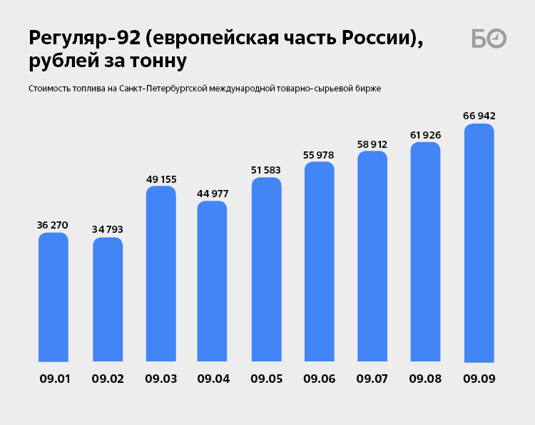 Стоимость бензина «Регуляр-92» начала расти 22 августа и по сегодняшний день обновляла свои максимум каждый торговый день подряд. Бензин Аи-92 подорожал на 10,4%, с 61,8 до 68,2 тыс. рублей за тонну.
