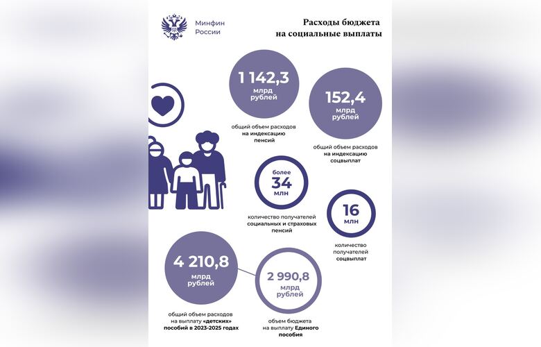 Минфин России опубликовал сведения о расходах федерального бюджета на соцподдержку населения, включая индексацию пенсий и социальных выплат. Данные приведены в графической карточке, согласно которой общий объем расходов на разнообразные «детские» пособия за 2023-2025 годы превысит 4,2 трлн рублей.