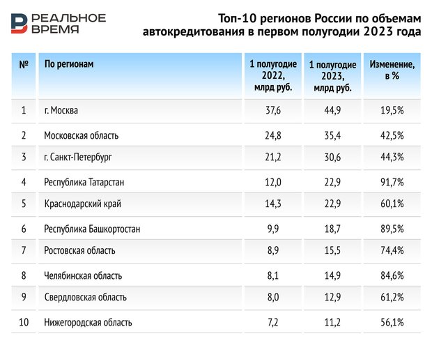 realnoevremya.ru Помимо Татарстана высокие темпы роста автокредитования среди топ-10 регионов РФ продемонстрировали Башкортостан (89,5%) и Челябинская область (84,6%).