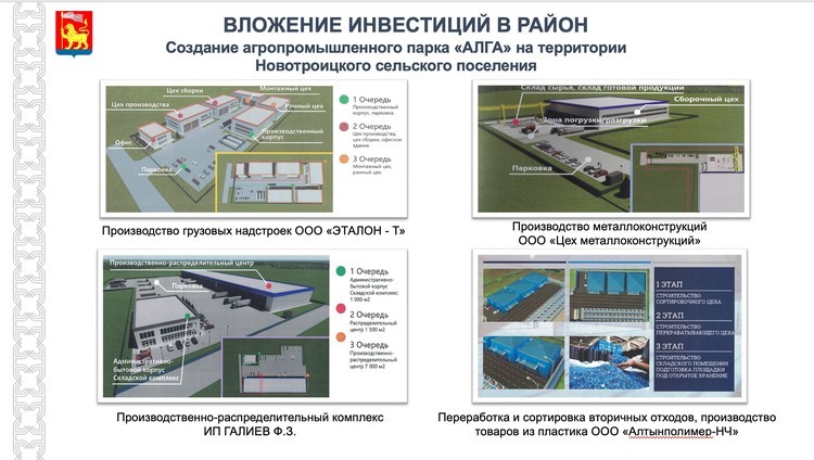 Известно, что в числе резидентов агропромышленного парка будет производитель грузовых надстроек ООО «Эталон-Т», производитель металлоконструкций ООО «Цех металлоконструкций», производственно-распределительный комплекс ИП Галиев Ф.З. и предприятие, занимающееся переработкой и сортировкой вторичных отходов, производством товаров и пластика ООО «Алтынполимер-НЧ».
