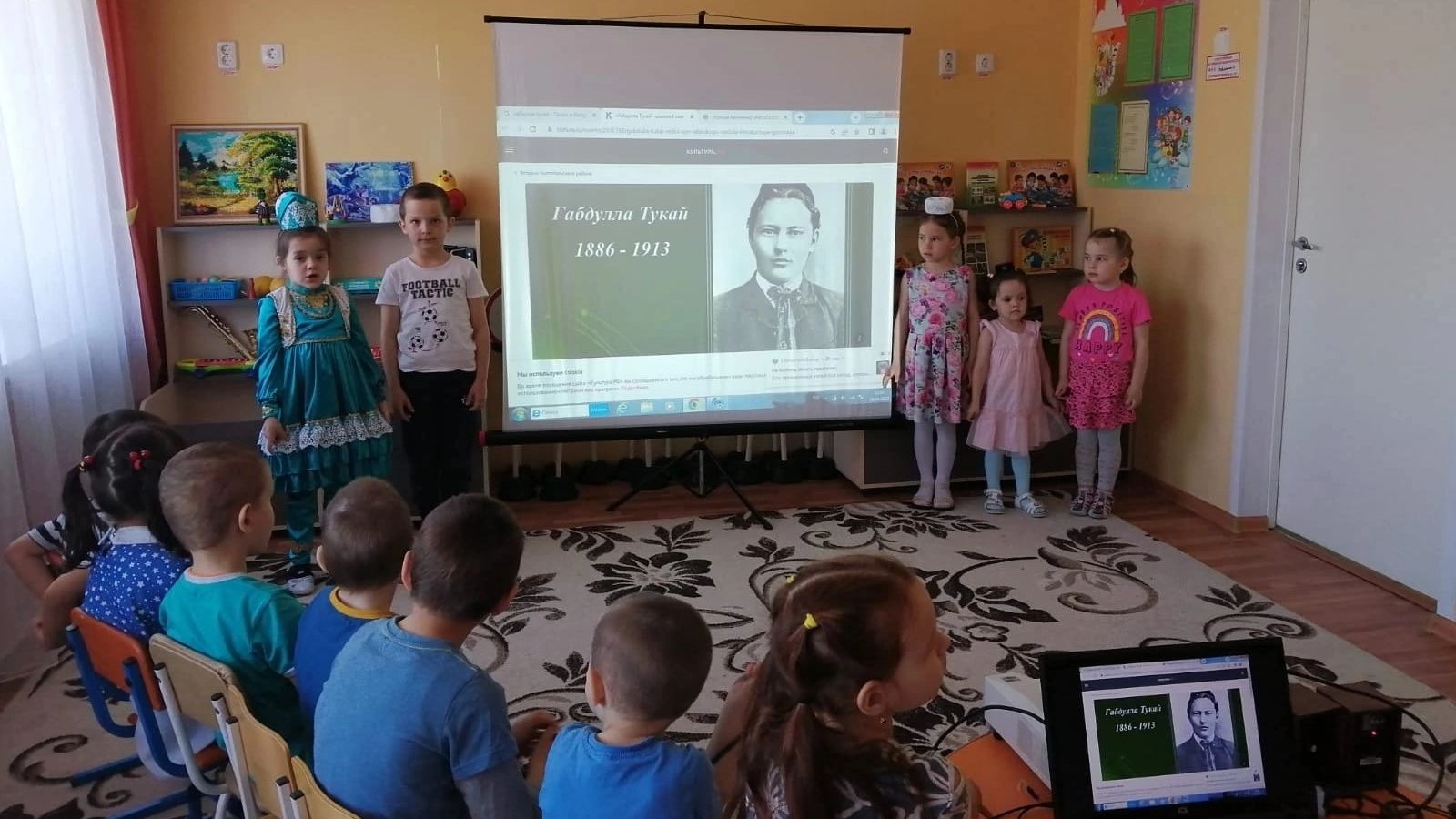 Его книги учат детей красоте родного края, доброте, призывают быть милосердным, справедливым и смелым. В честь 137-летия великого поэта, для юных читатаелей библиотеки был проведен литературно-музыкальный вечер «Милләтемнең җырчы тургае”. На мероприятии ребятам было рассказано о тяжелом детстве поэта, о его жизни и творчестве. Учаәиеся услышали много нового из его биографии. Читали стихотворения, в которых он затрагивал тему Родины, родного языка, жизни простого народа, природы, познакомились со сказками – поэмами: «Су анасы», «Печән базары, яхуд Яна Кисекбаш», «Шүрәле». Небольшая викторина «Угадай произведение Тукая по иллюстрации» – пришлась по вкусу ребятам, и они с удовольствием отвечали на вопросы. Была возможность и у детей рассказать стихи великого татарского поэта. А в конце ребята с удовольствием спели песню «Туган тел», которая стала гимном татарского народа.