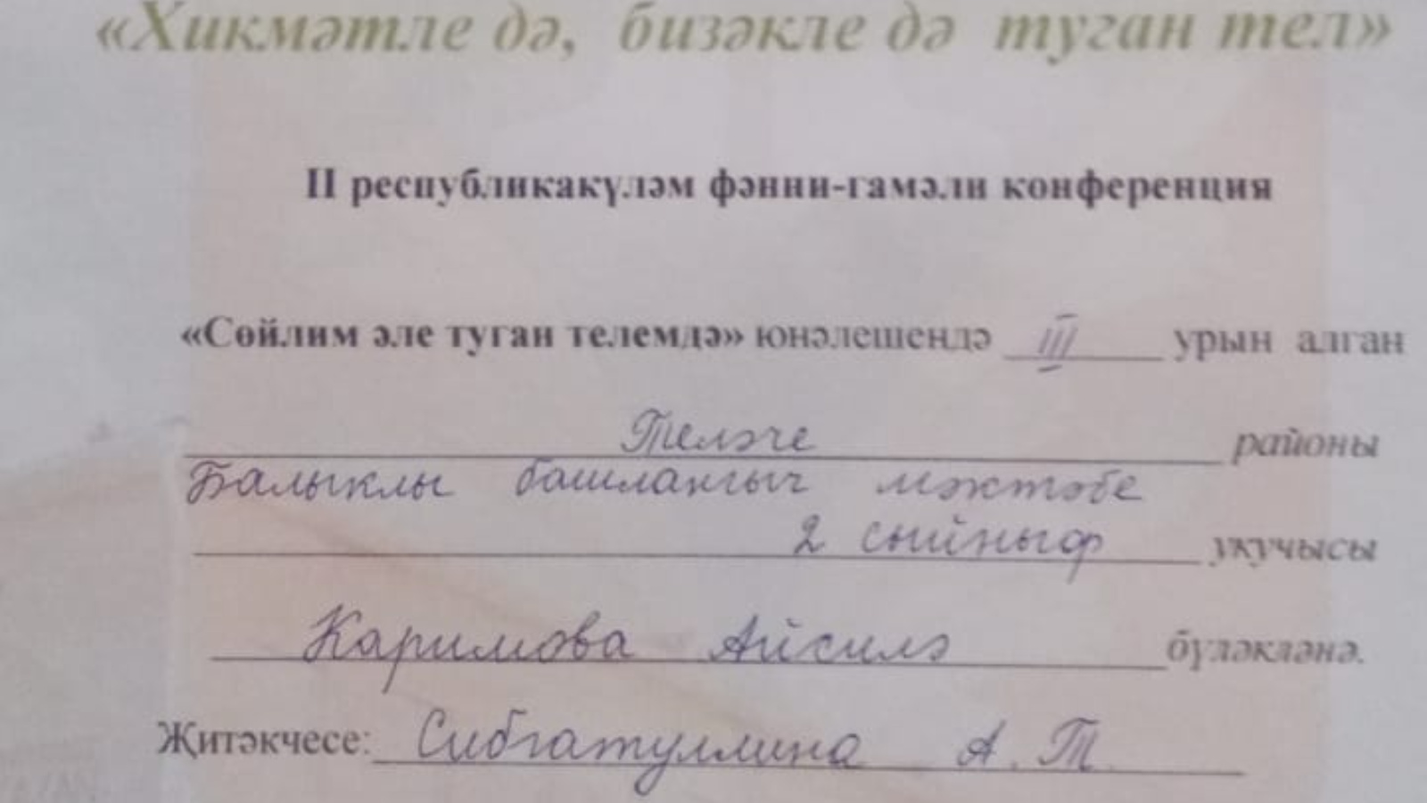 9 февраля в МБОУ “Олуязская СОШ им.Г. Х. Хабибрахманова” Кукморского района прошла 2 республиканская научно-практическая конференция “ Хикмәтле дә, бизәкле дә туган тел". Ученица 2 класса Балыклинской начальной школы Каримова Асиля успешно выступила на этом мероприятии и заняла 3 место.