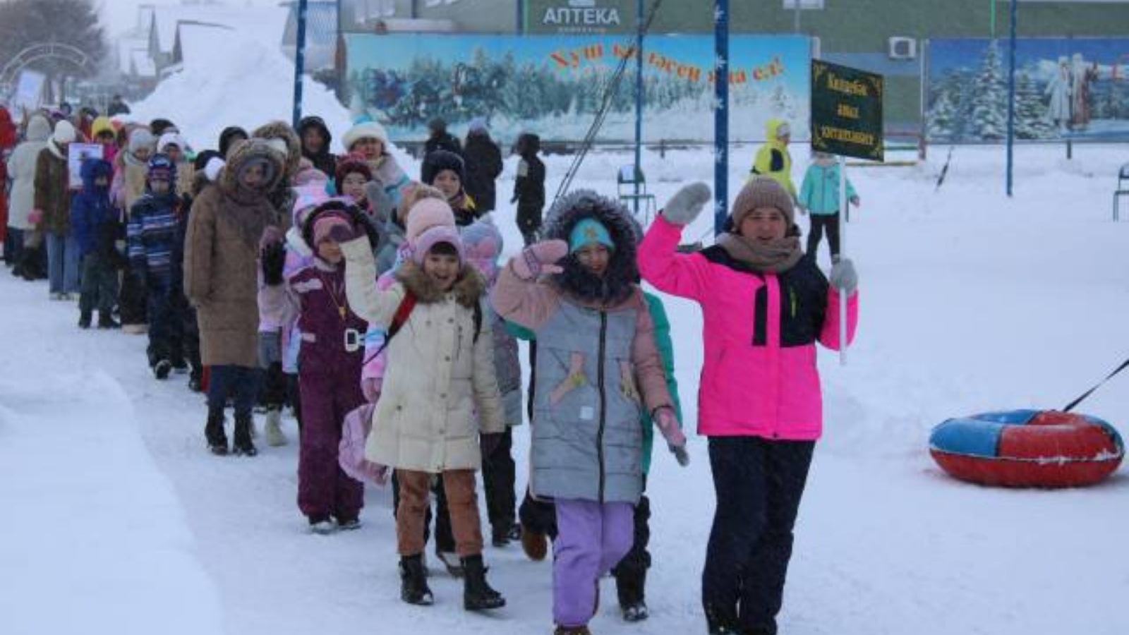 2 января заведующая Кильдебекской сельской библиотеки участвовала с детьми на праздники возле центральной ёлки Сабинского района. Это дети, которые участвовали в проекте «Литературная поляна».