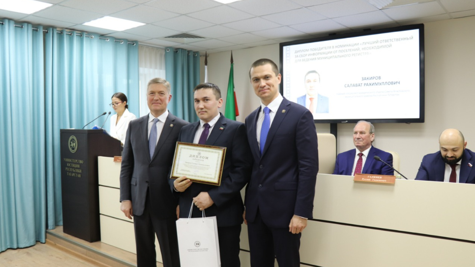 Закиров Салават Рахимуллович - юрист аппарата Совета Апастовского муниципального района Республики Татарстан победил в номинации «Лучший ответственный за сбор информации от поселений, необходимой для ведения муниципального регистра». На итоговой коллеги Министерства юстиции Республики Татарстан первый заместитель Премьер-министра Республики Татарстан Нигматуллин Рустам Камильевич и министр юстиции Загидуллин Рустем Ильдусович ему вручили диплом победителя и памятные подарки.