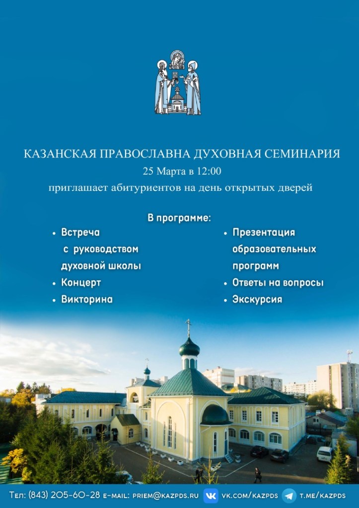 25 марта 2023 года Казанская православная духовная семинария приглашает абитуриентов посетить духовную школу.