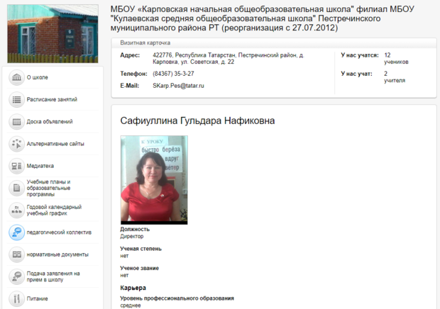 скриншот realnoevremya.ru страницы портала edu.tatar.ru Карповская начальная школа находится в селе Карповка в здании на ул. Советской, 22. Согласно данным портала «Электронное образование Республики Татарстан», в ней работали два учителя и учились 12 учеников.