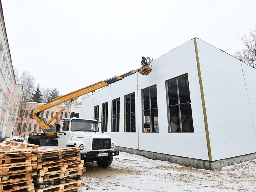 Строительство корпуса идет по графику, на сегодня работы выполнены на 25%. На объекте трудятся порядка 20 человек, в определенных видах работ задействуют до 35-40 специалистов. Рабочие вынесли инженерные сети, обустроили фундамент, кровлю и стены, а сейчас занимаются отделкой фасада. После потепления они приступят к укладке пола.