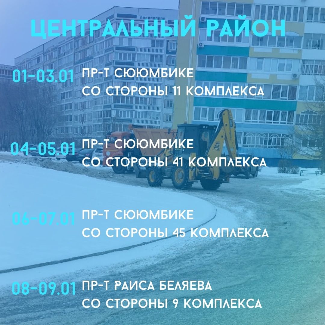 До 9 января на предприятии обязуются почистить проспект Сююмбике со стороны 11, 25, 41, 45, 47, 49, 50 комплексов, улицу Беляева со стороны 9 комплекса, Московский проспект со стороны 62 комплекса, улицу Хади Такташа в районе 18 микрорайона, улицу Низаметдинова со стороны 15 комплекса и проспект Фоменко со стороны 25 микрорайона.