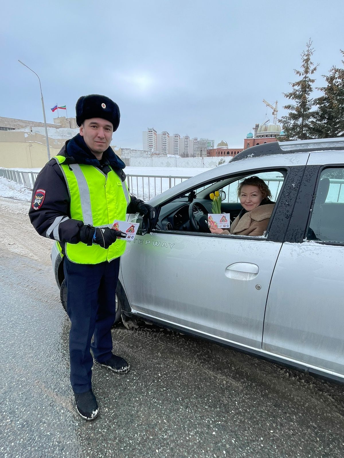 Сотрудники Госавтоинспекции Набережных Челнов седьмого и восьмого марта останавливали на дорогах города женщин водителей и вручали им букеты тюльпанов в честь Ме