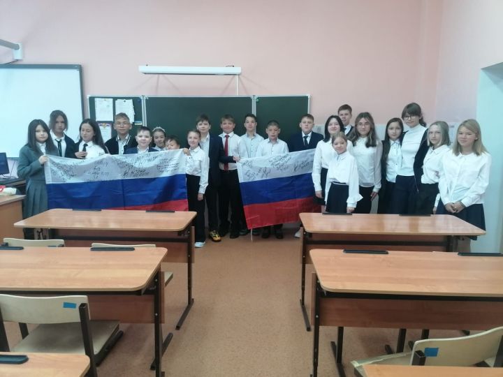 На переданном в подарок полотнище, бойцы специальной военной операции написали свои позывные и пожелания учителям, школьникам и их родителям, которые не равнодушны к судьбе страны. Боец с позывным «Грифон» написал крылатое выражение, возникшее после выхода художественного фильма «Александр Невский»: «Кто с мечом к нам придёт, от меча и погибнет!». «Татары – братья!» - пишет другой военный, акцентируя тем самым благодарность Татарстану за мощную поддержку Республики фронту.