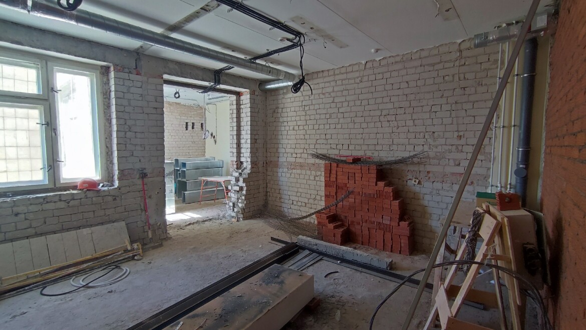 На 4 этаже уже устанавливают мебель и медицинское оборудование. На 3 этаже заканчиваются демонтажные работы, прокладка инженерных сетей и штукатурка стен.
