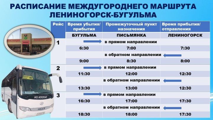 С сегодняшнего дня запущен долгожданный автобусный маршрут до Бугульмы, о котором так много просили жители. Благодаря вашим обращениям через чат-бот «Ромашка», комментариям в социальных сетях и местных пабликах, мы смогли организовать удобное автобусное сообщение с соседним городом.