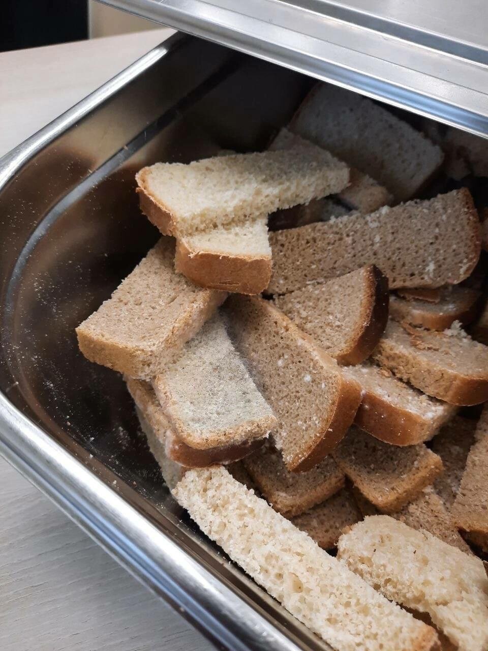 Однако как рассказал наш источник, в этой емкости не собираются отходы. Из этой хлебницы всегда подают хлеб ученикам.