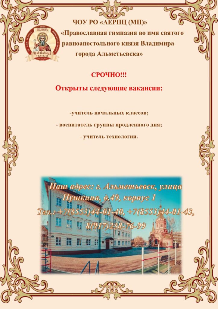 Вакансии в Православной гимназии Альметьевска