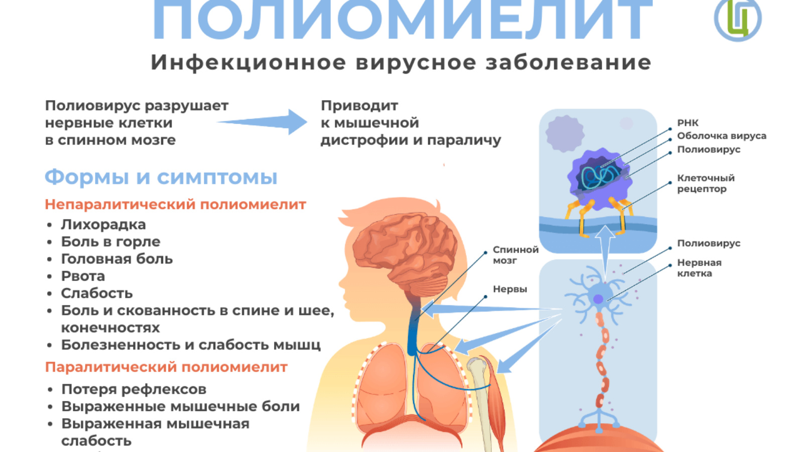 Полиомиелит — это высоко контагиозное (высоко инфекционное) инфекционное заболевание, вызванное полиовирусом. Полиовирус поражает центральную нервную систему, может вызвать паралич и даже смерть.