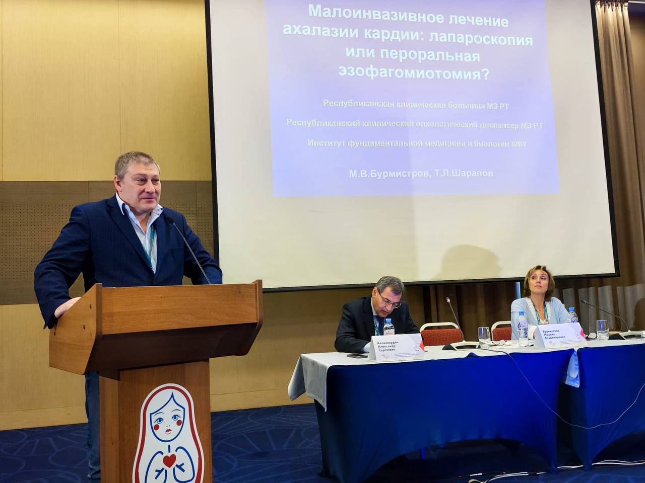 Профессор Михаил Бурмистров выступил с докладом “малоинвазивное лечение ахалазии кардии”, заведующий отделением Валерий Матвеев редставил доклад об эндоскопических технологиях в лечении синдрома Бурхаве, осложненного медиастинитом и эмпиемой плевры.