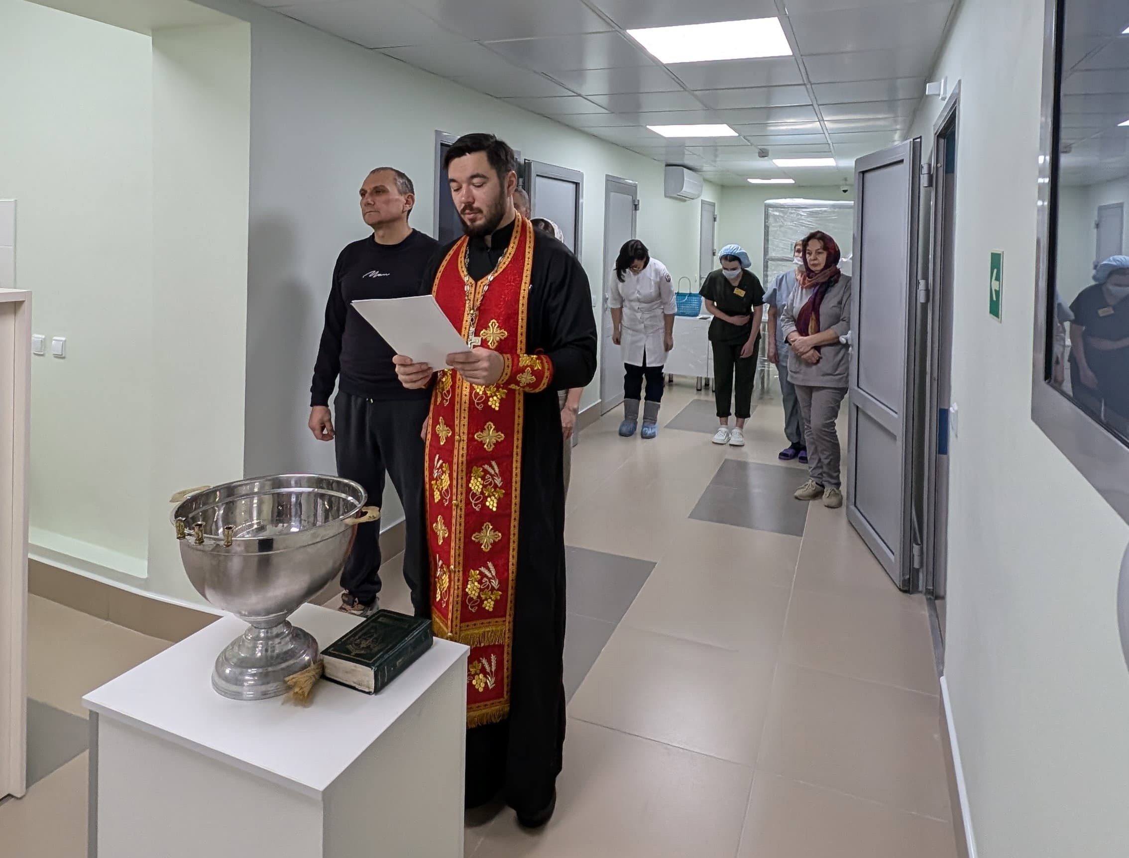 Чин освящения здания совершил благочинный Заинского округа иерей Вячеслав Фёдоров. Священнослужитель прочитал молитву и окропил святой водой помещения, кровати больных, медицинское оборудование, мед.персонал.