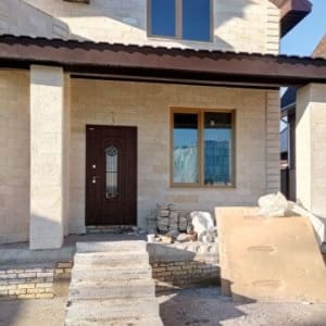 Двухэтажный дом в зоне Д, напротив бассеина из газобетона и ракущечника пред.честовая отделка под обои, вода и свет заведены.Залита монолитная лестница.Газ проведут в этом году.